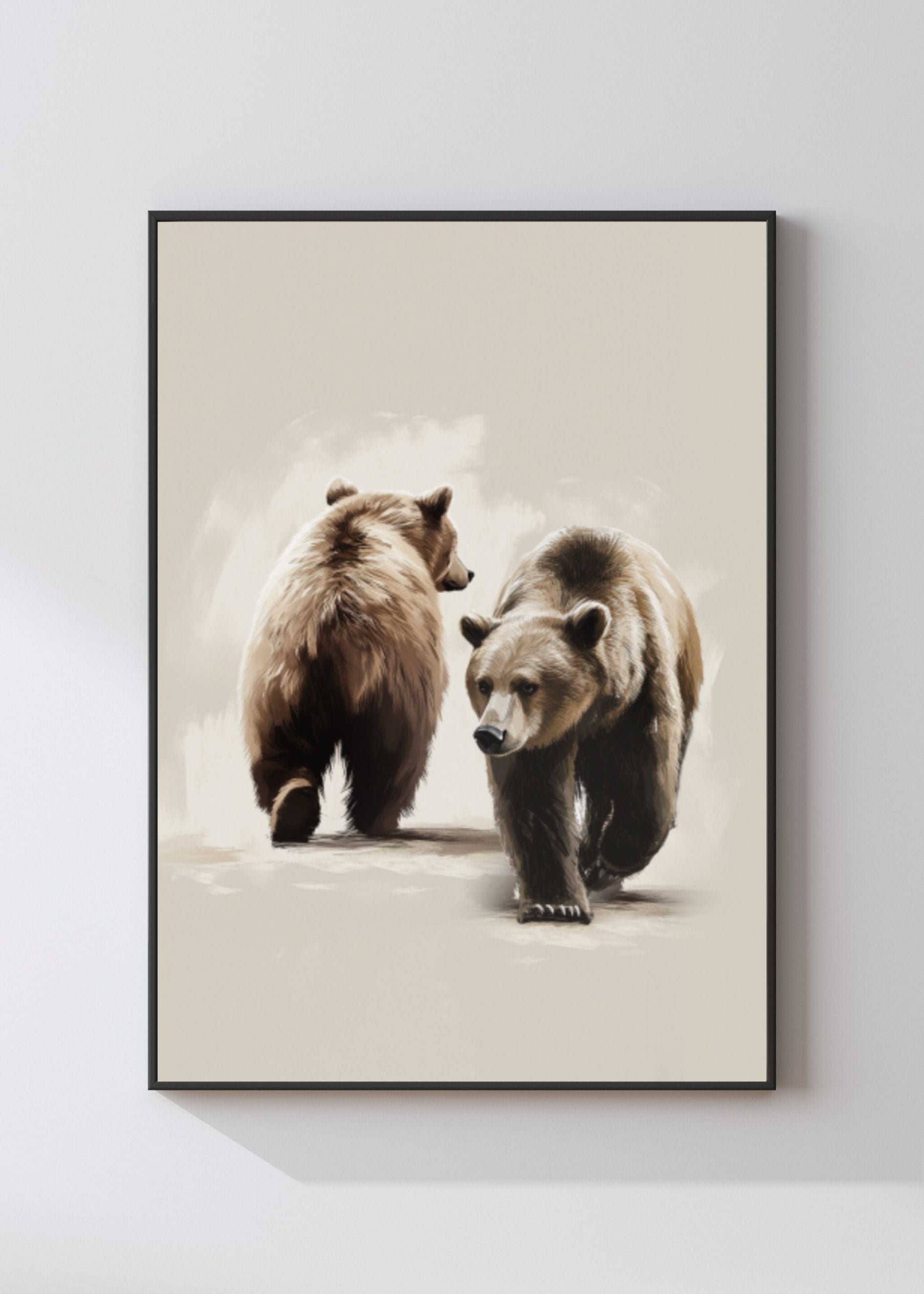Bjørner i skjønn harmoni med nordisk, stilren beige bakgrunn. Perfekt til de som elsker nordisk villmark. Kombiner gjerne sammen med noen av de andre plakatene i samme uttrykk.