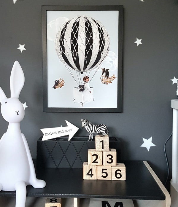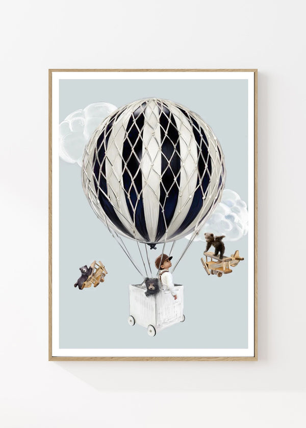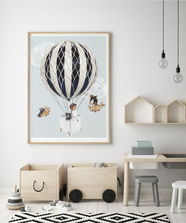 Popular Tobias in his imaginary hot air balloon, and how cute are the bears flying next to him! This poster has become a classic in our children's collection. A light blue poster for the boys' room cannot go wrong.