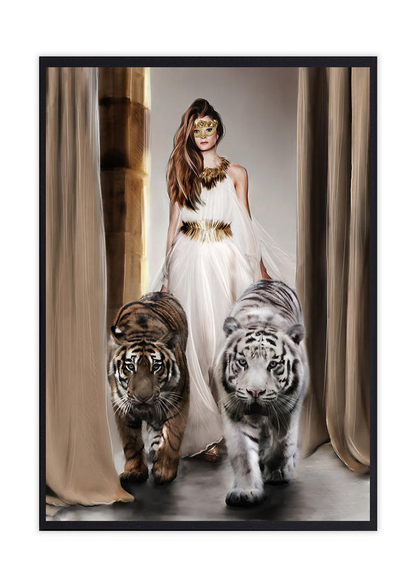 Let yourself be amazed by the fashionable Lux, where she comes walking with two beautiful tigers by her side. It's no secret that this big feline is one of Linn's favourites. In her completely unique way, she manages to recreate their looks with her digital drawing pen. Notice the gorgeous elements of gold!
