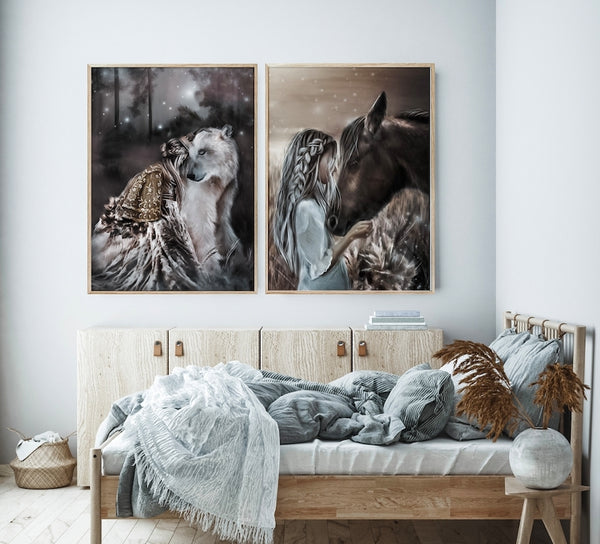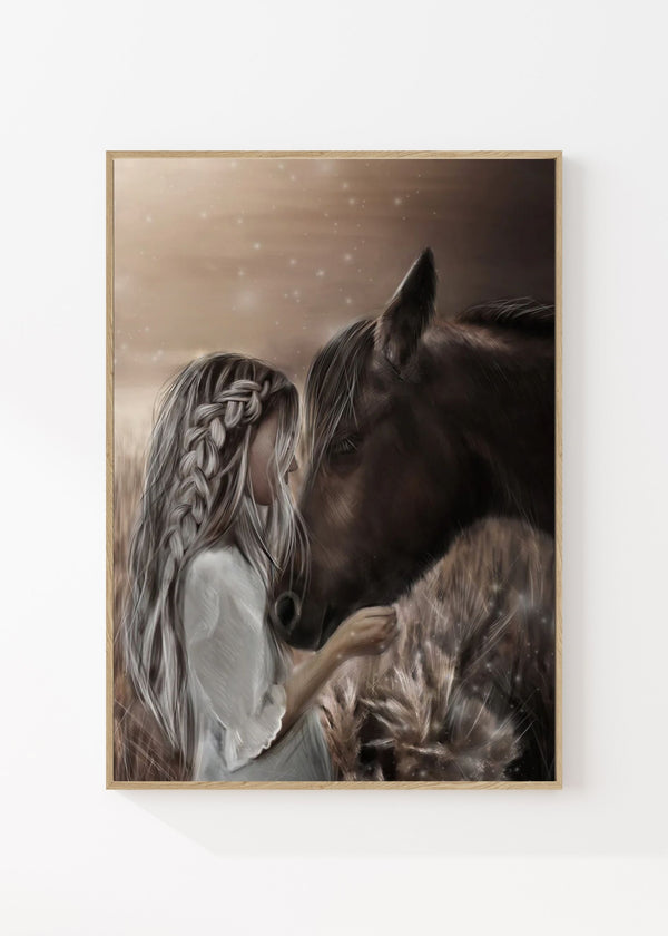 A girl with her horse Sam. Perfect for any children's room where a little horse girl lives. The color palette in brown and beige and will adapt to most wall colours! Feel the magic of this unique friendship.