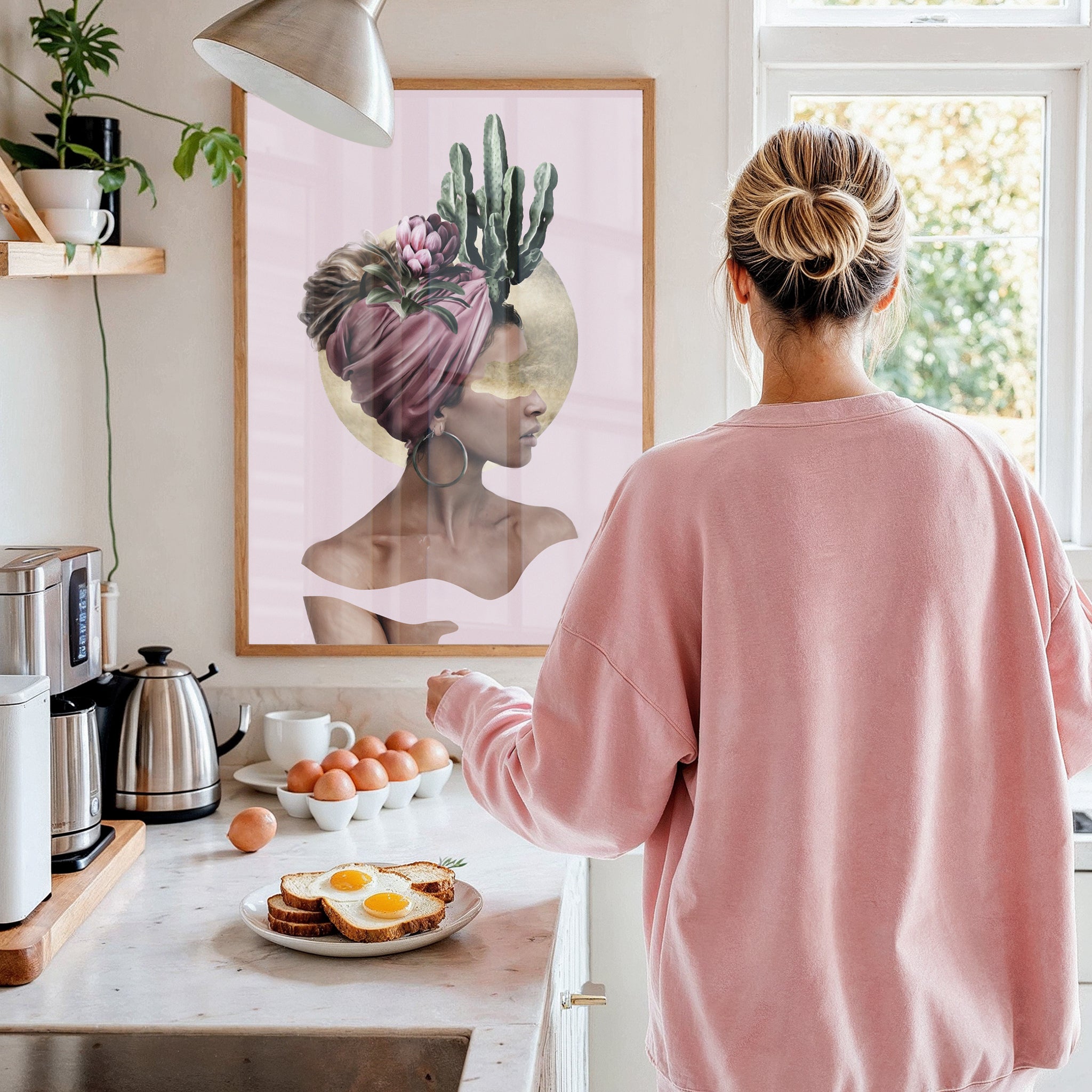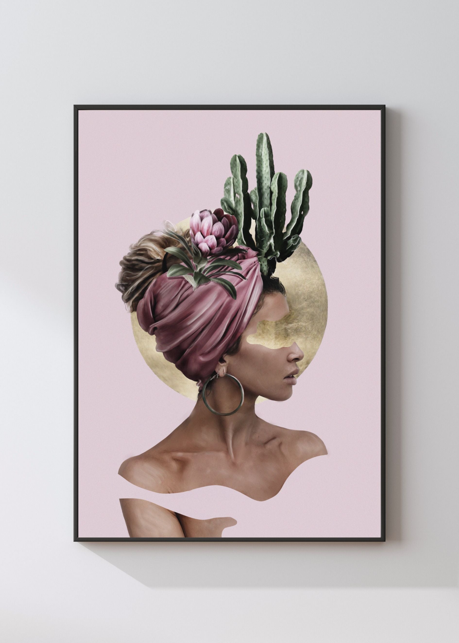 Alba is a colorful and stylish art poster that exudes confidence, strength and playfulness. With warm tones, green cacti and feminine details in pink and gold, this motif creates a unique eye-catcher in any room. The hand-drawn style combined with collage elements and gold texture gives the poster an exclusive and modern touch. Perfect for those who want to add personality and artistic depth to their home.