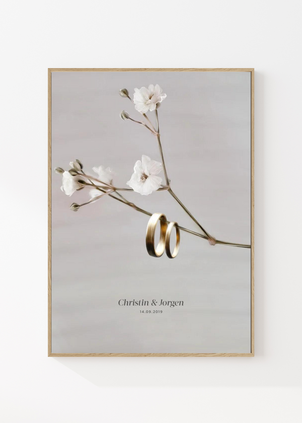 The branch with white flowers holding up two gold rings symbolizing marriage. A stylish declaration of love that fits into any modern home. A memory for life that will be appreciated year after year. Enter the desired personal text below. Personal posters have a delivery time of 7-10 business days.