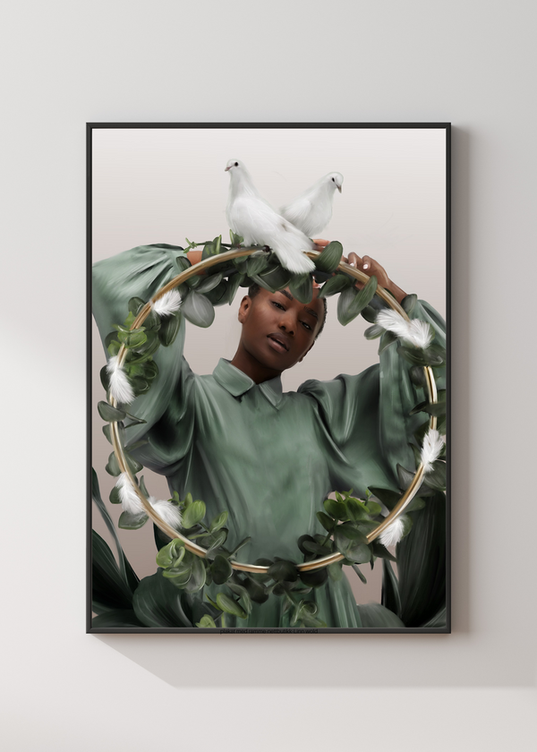 A statement print that will lift the atmosphere in a room. The green details against the light background are a lovely combination, and will fit into many interior styles. White doves have long been, and still are, a symbol of peace and they complement this poster in a lovely way.