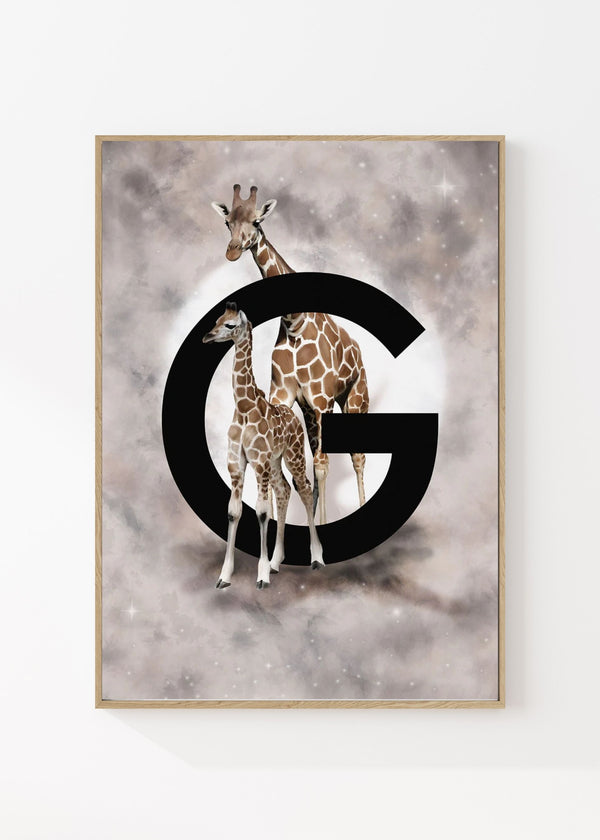 Poster with the letter G and beautiful giraffes! Perfect wall decoration for the children's room. Select the desired size below. Note! This poster is just the letter G, without personal text/name.