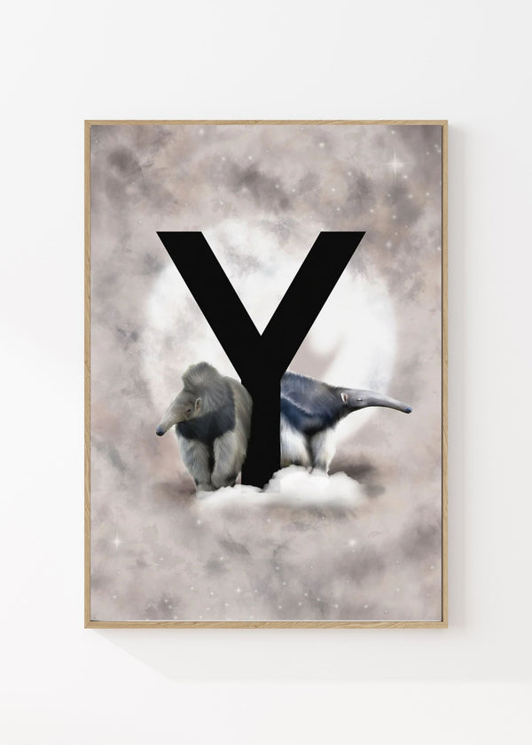 Poster with the letter Y and two funny yurumies (large anteaters). Perfect wall decoration for the children's room. Select the desired size below. Note! This poster is just the letter Y, without personal text/name.