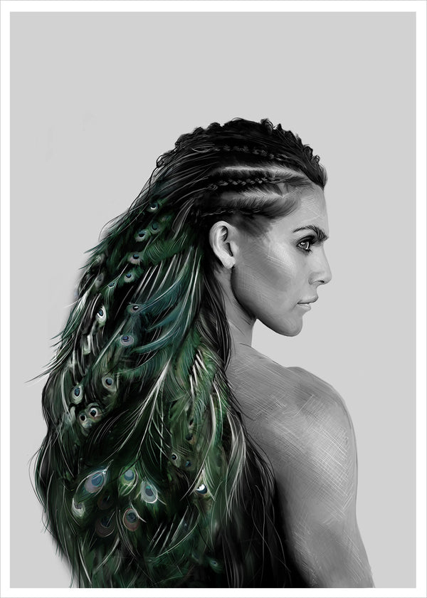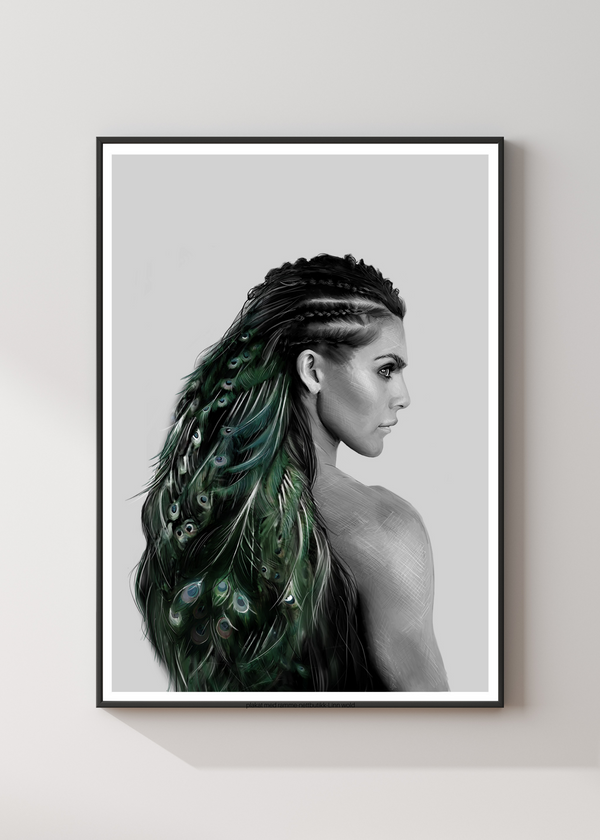 An art poster that oozes strength and girl power! Notice the nice detail with the peacock feathers in the hair. As many may have guessed, this poster is of course based on the strong Funkygine, Jørgine.