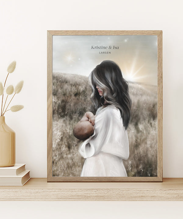 This is Sanna! You see her holding her little baby in her arms. A personal gift for a baby shower or maternity visit! Here you can, for example, add the mother's and child's name, or surname. Personal posters have a delivery time of 7-10 business days.