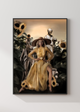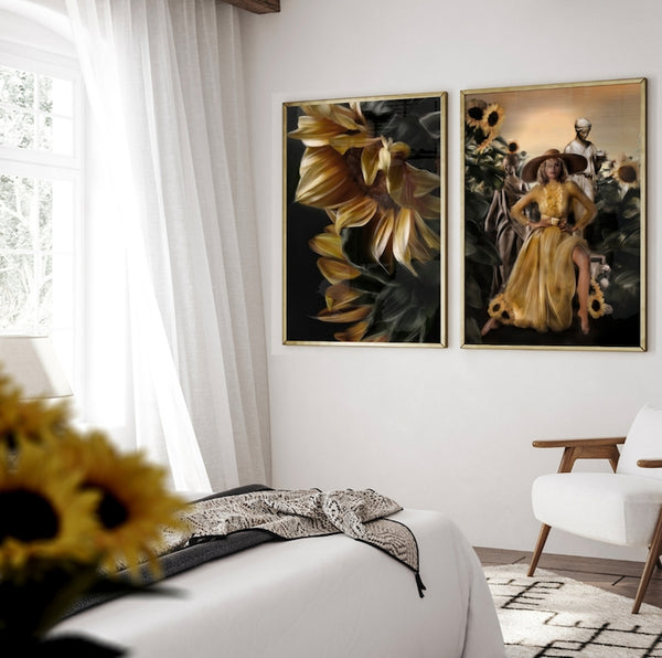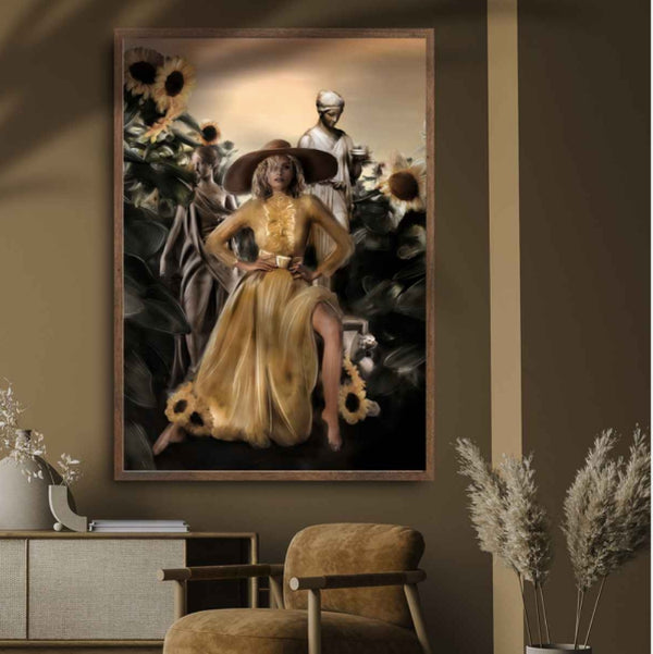 A lovely print inspired by Italy! In a flower meadow of sunflowers, a woman stands and poses in a beautiful yellow dress. Note the statues behind her!