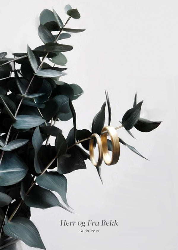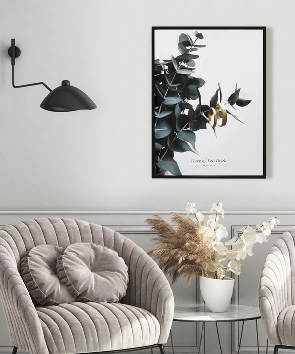 Green eucalyptus holding up two gold rings symbolizing marriage. A stylish declaration of love that fits into any modern home. A memory for life that will be cherished year after year. Get this poster with the text of your choice to make it even more personal for you or someone you love. Personalized posters have a delivery time of 7-10 business days.
