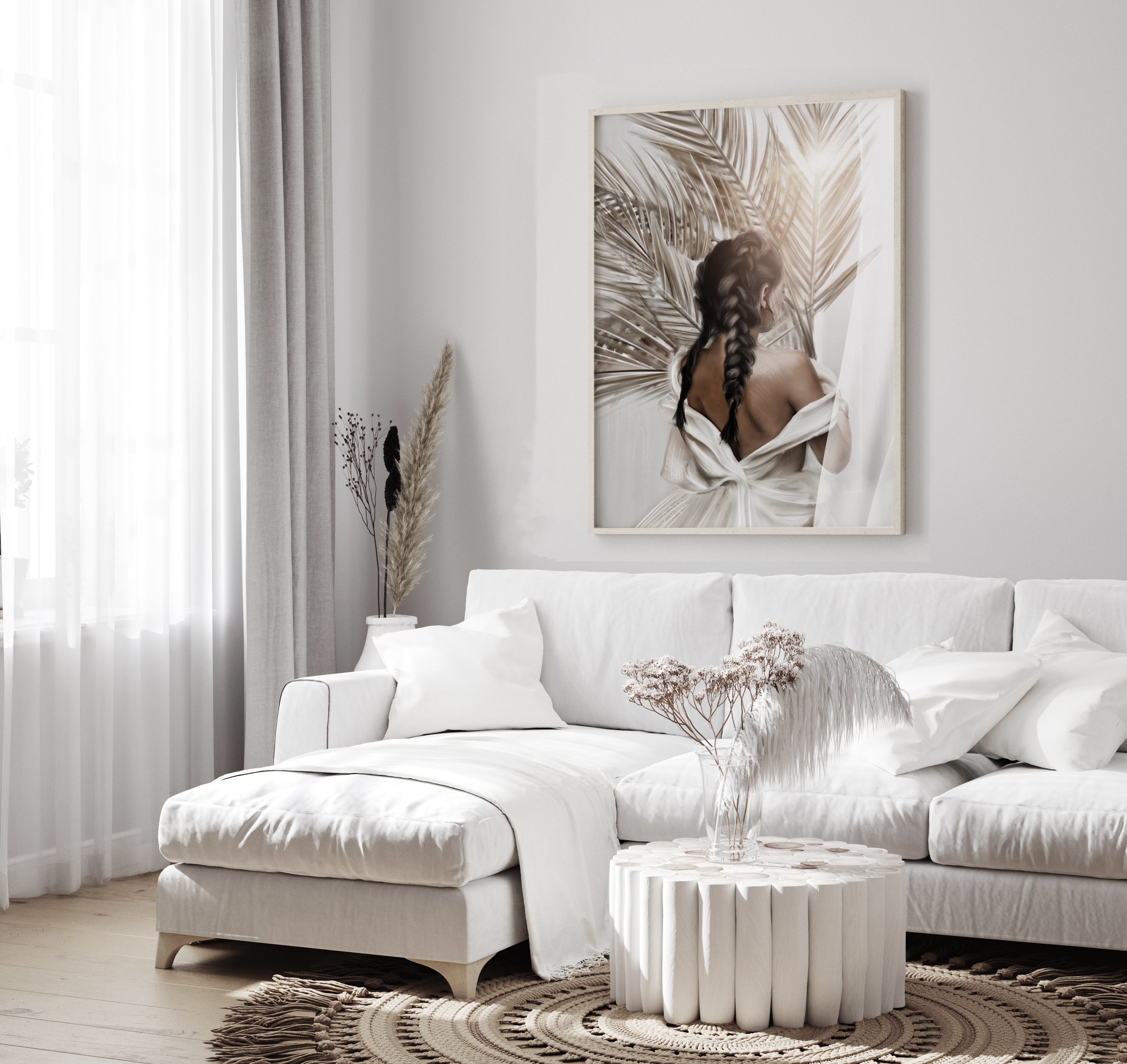 Eva på lerret! En kvinne står ved palmetrær med ryggen mot oss. Hun har på seg en sommerlig hvit kjole og det lange mørket håret er samlet i vakre fletter. Drøm deg bort i en sydlig bris! Kombiner gjerne med lys eikeramme for en perfekt finish.