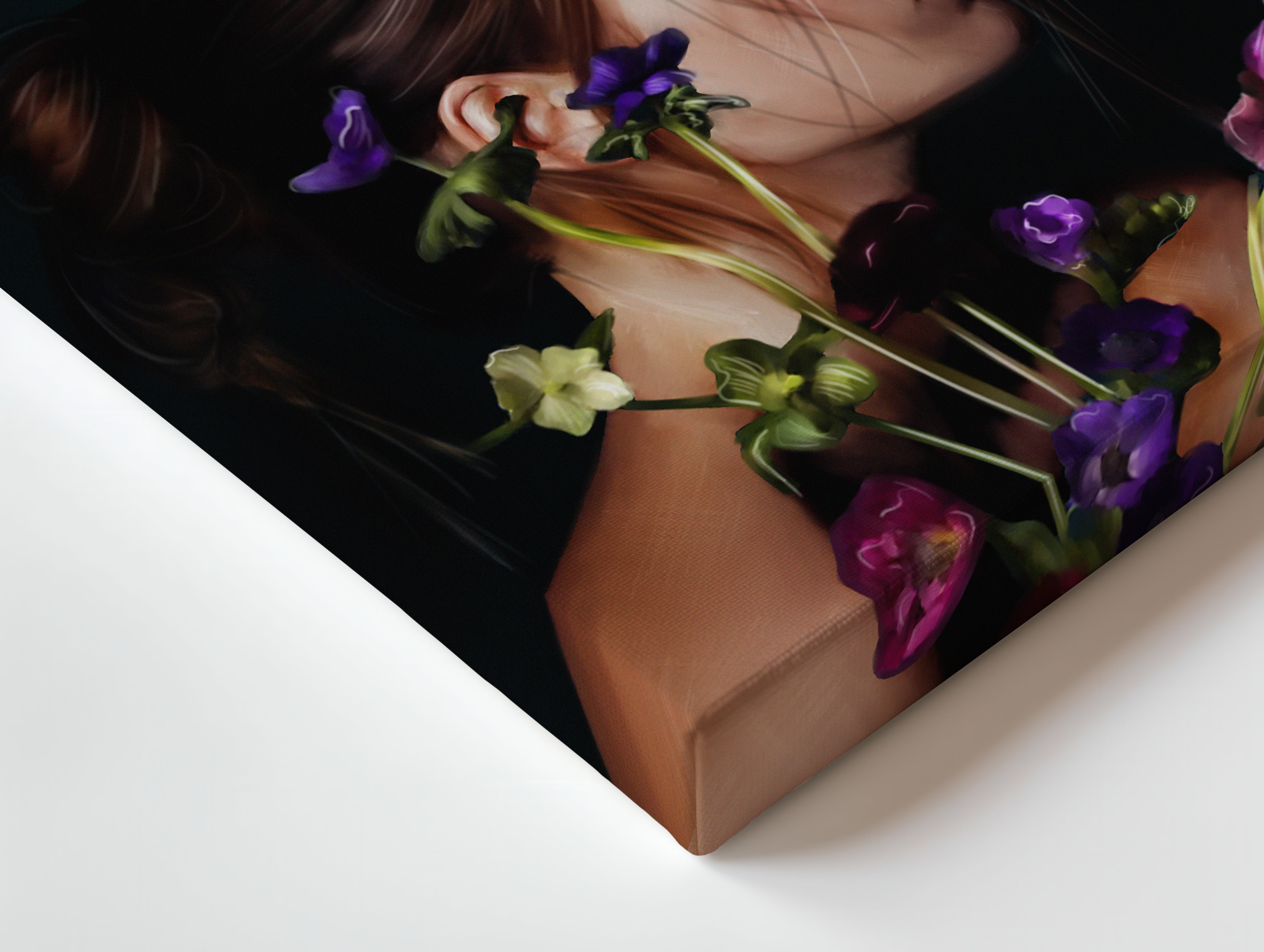 Maria på lerret! Et friskt pust til veggen over sofaen eller på soverommet! Med vakre farger og spennende detaljer. “Maria” er en kvinne som poserer fra siden, sammen med et delikat hav av blomster. Den dype grønnfargen i bakgrunn setter virkelig prikken over i’en!