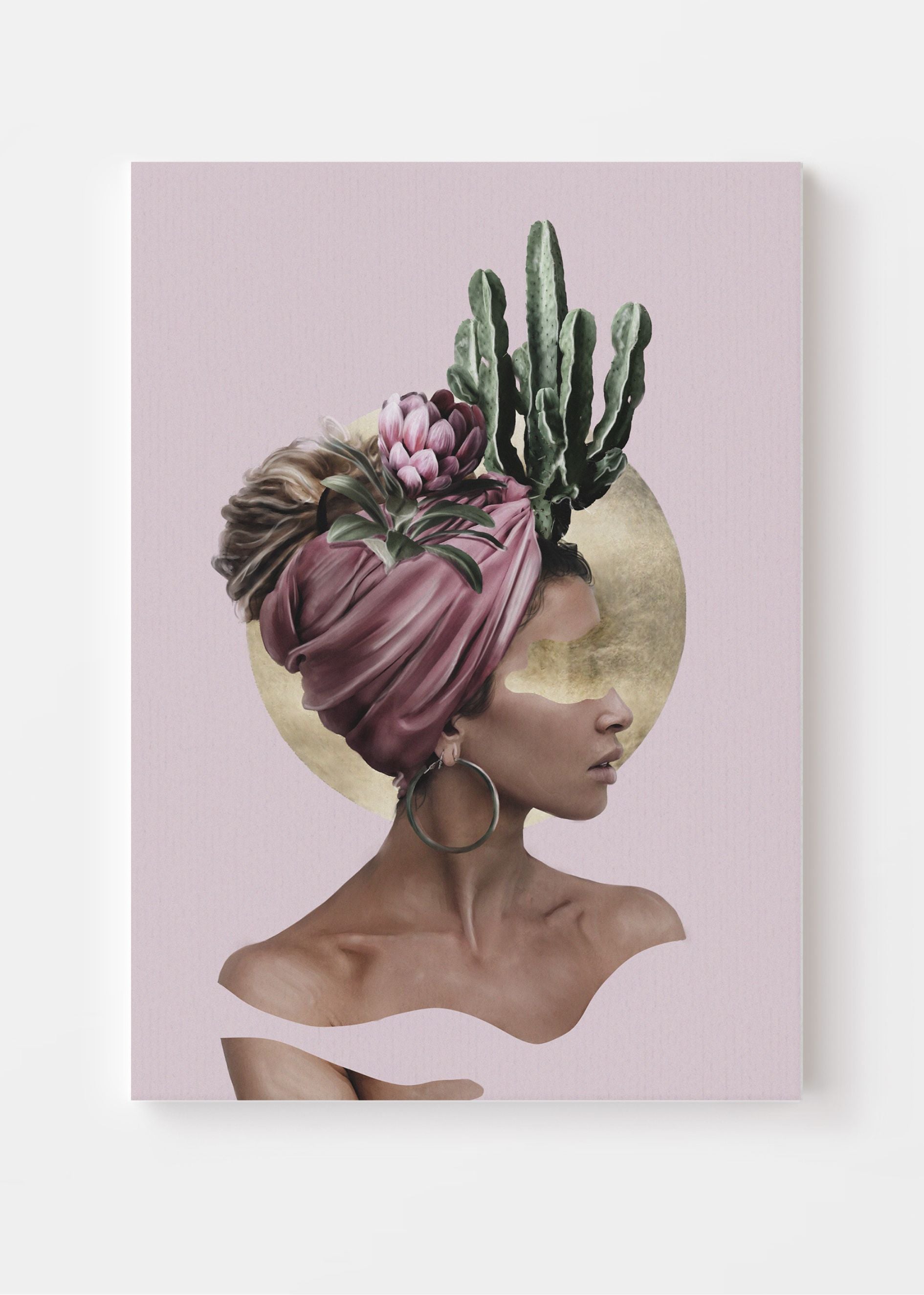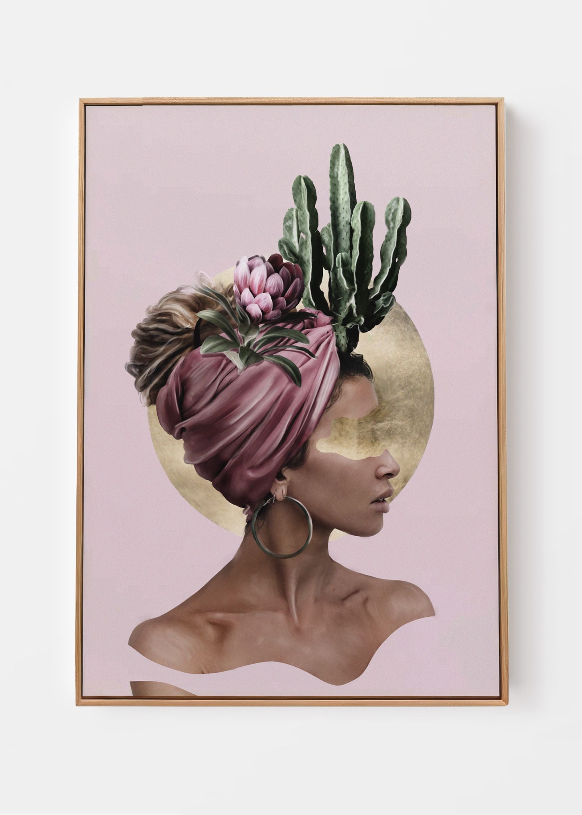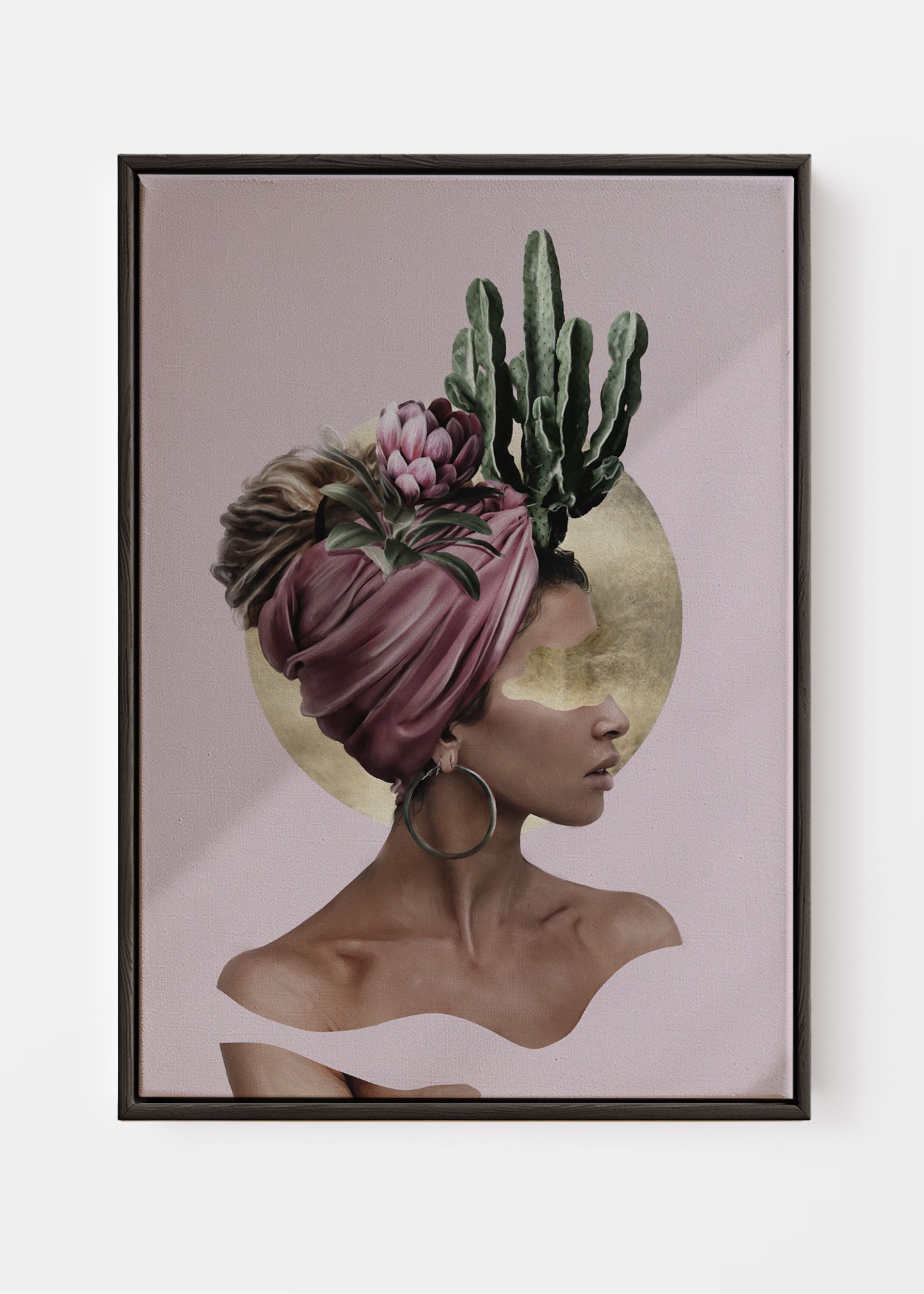 Alba er fargerik og raffinert, og utstråler selvtillit, styrke og lekenhet. Med varme toner, grønne kaktuser og feminine detaljer i rosa og gull, gir dette motivet et særegent og kunstnerisk preg som fungerer like godt på lerret som på papir."