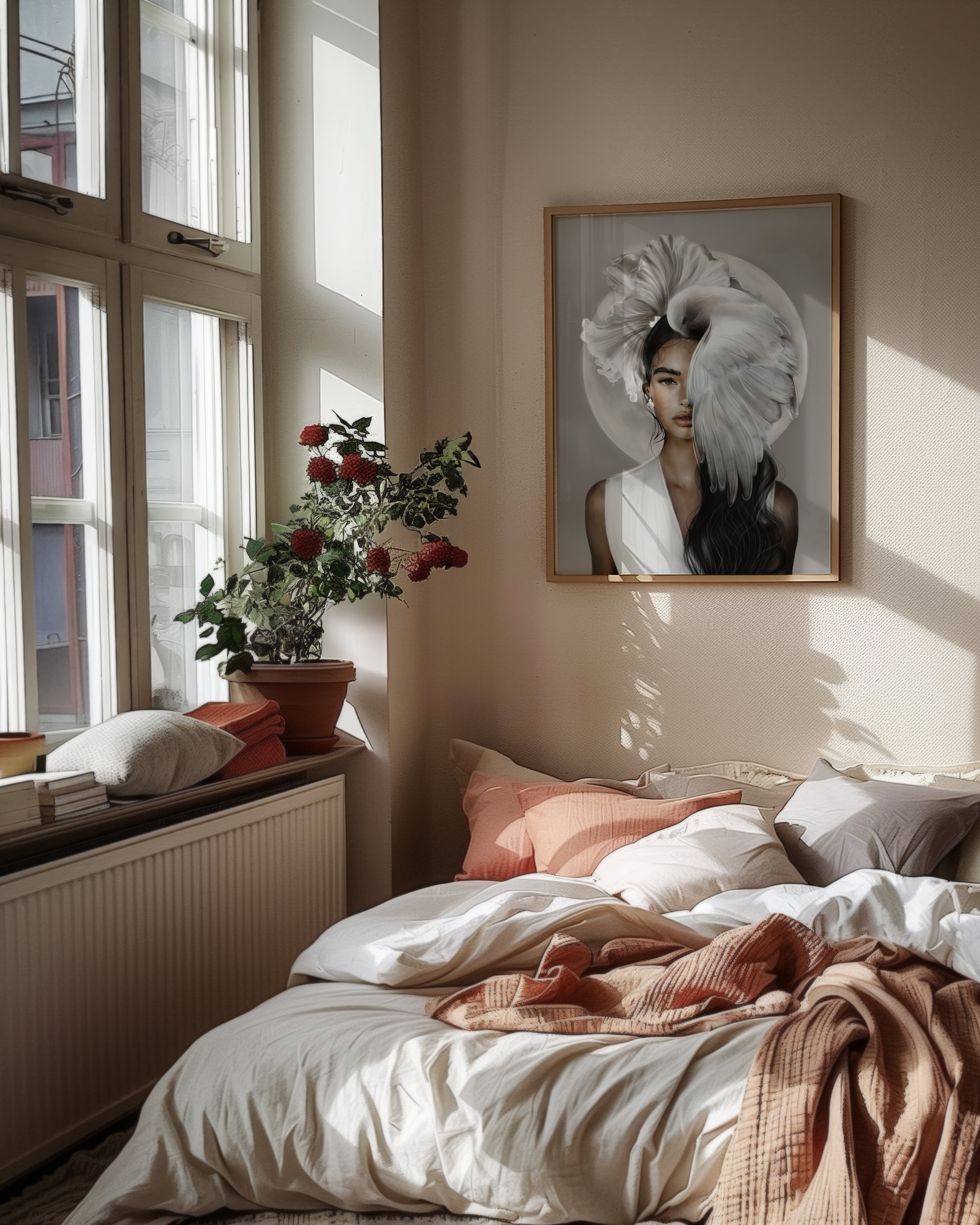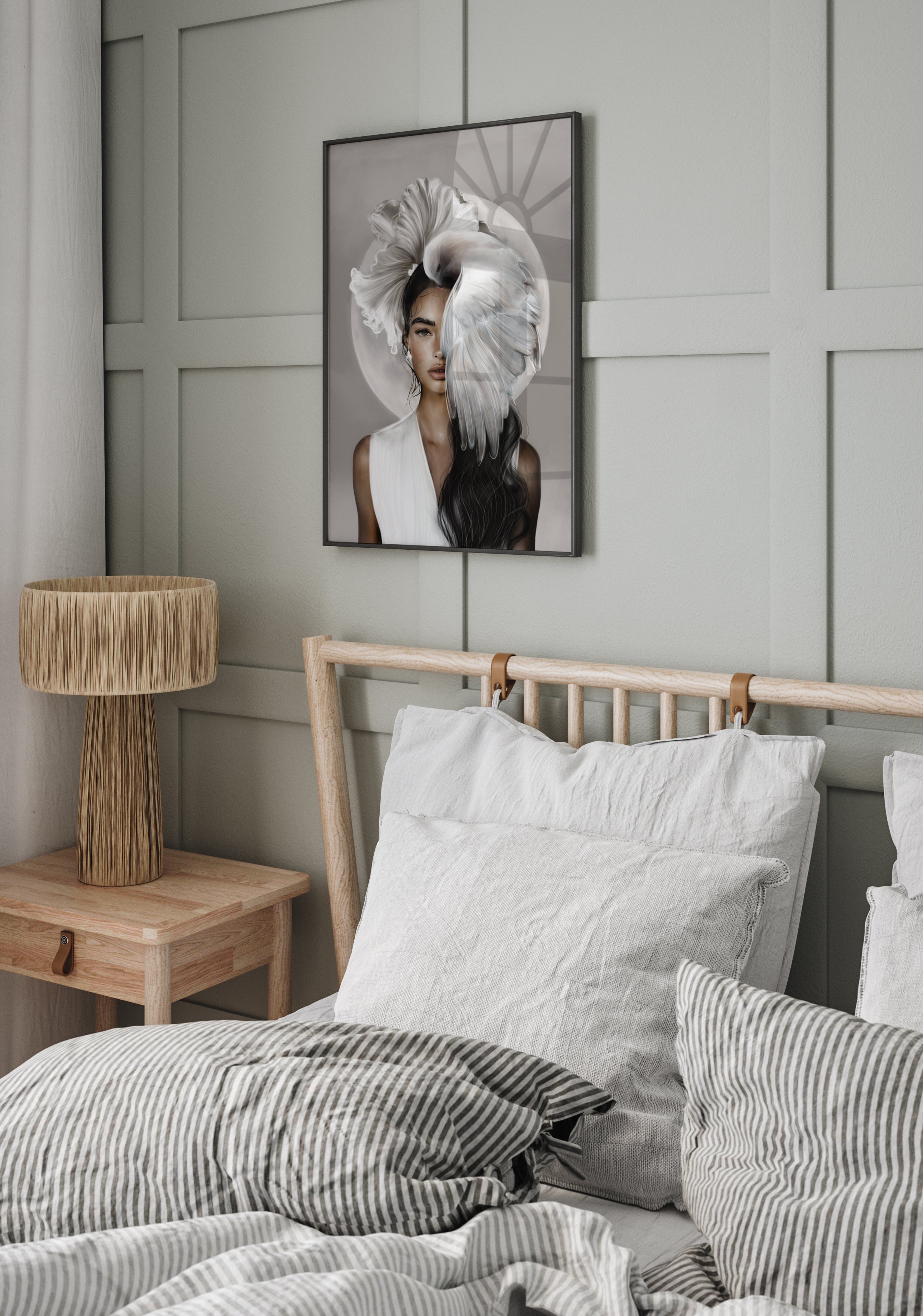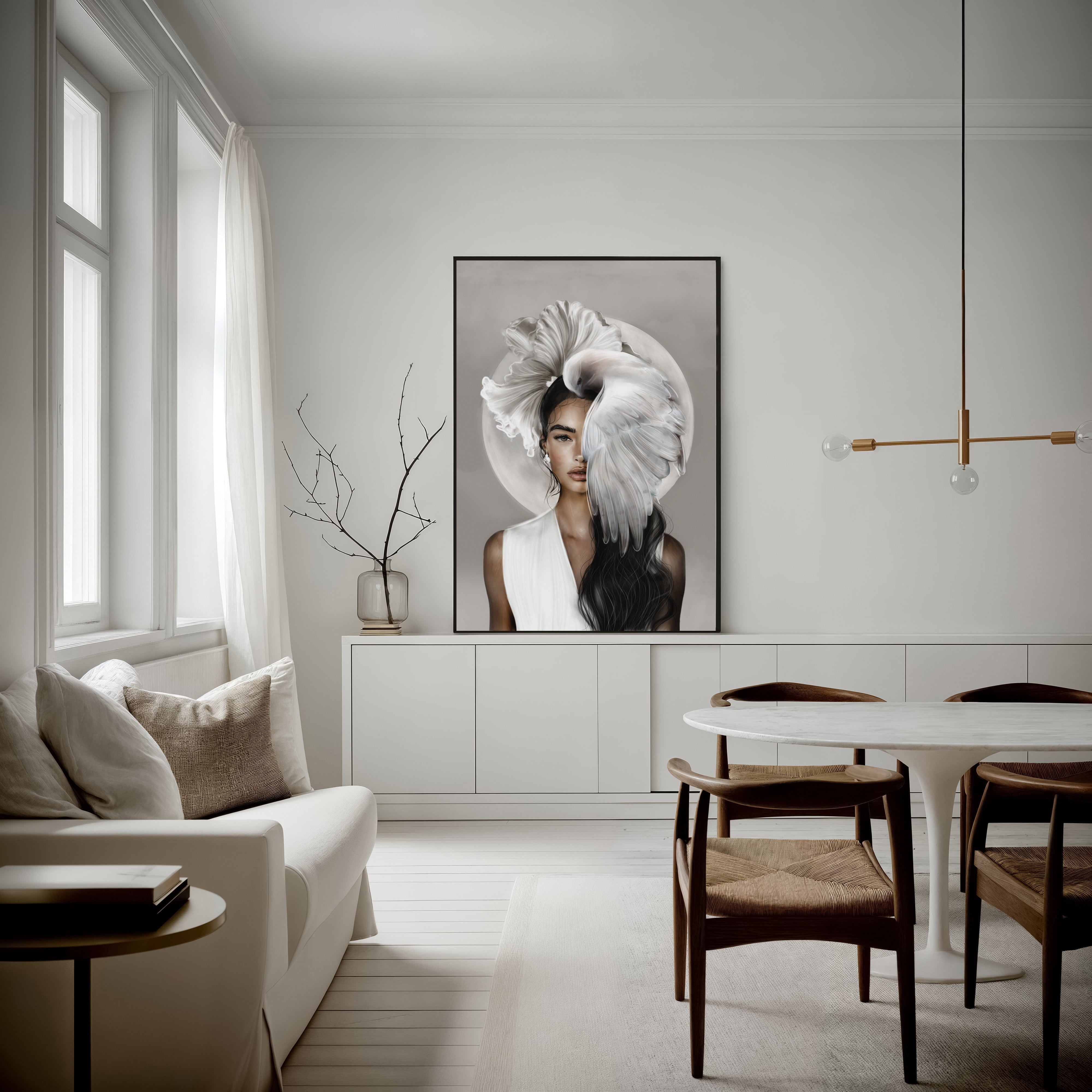 Den sarte kontrasten mellom det mørke håret, de myke fjærstrøkene og den blomstrende formen skaper en balansert helhet som føles både kraftfull og drømmende på samme tid.