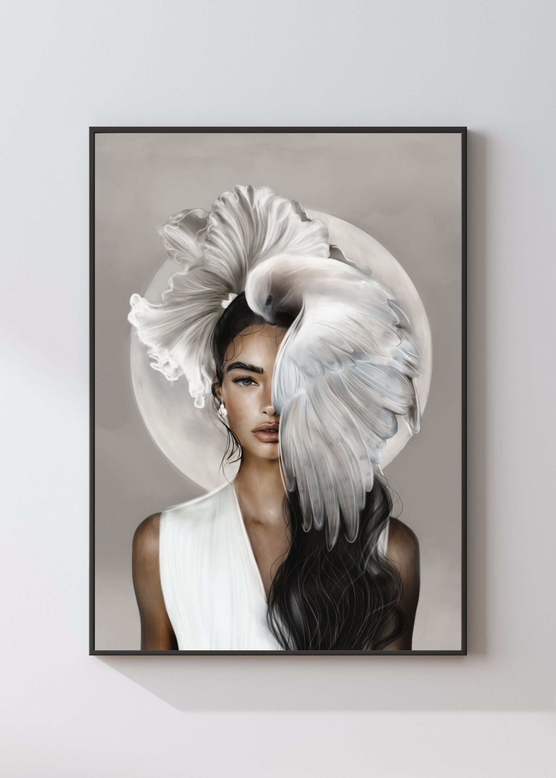 Et drømmende motiv der den hvite fuglen smelter sammen med en hvit blomst bak hodet – et symbol på fred, frihet og indre styrke.
