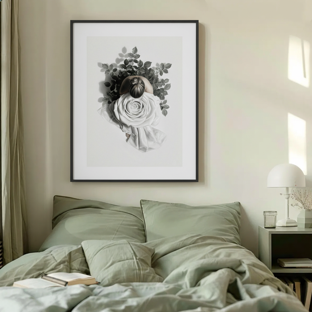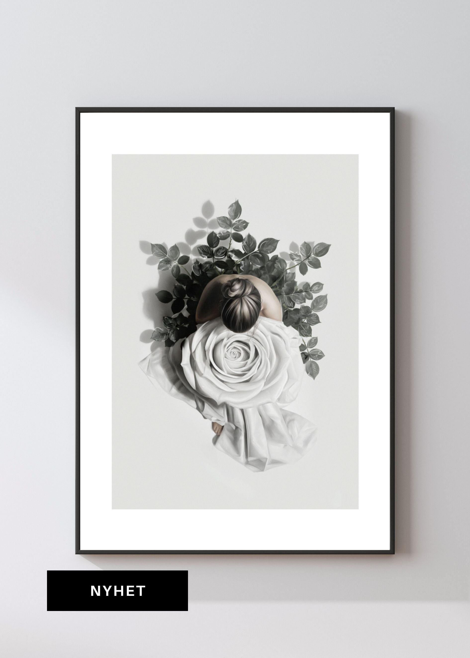 Blanca er en drømmende og poetisk kunstplakat som formidler ro, sårbarhet og styrke på samme tid. En kvinne sett ovenfra smelter sammen med en stor, hvit rose, som om hun vokser ut av naturen selv. De myke bladene og de dempede tonene skaper et stille øyeblikk, perfekt for et hjem som trenger pust og balanse.