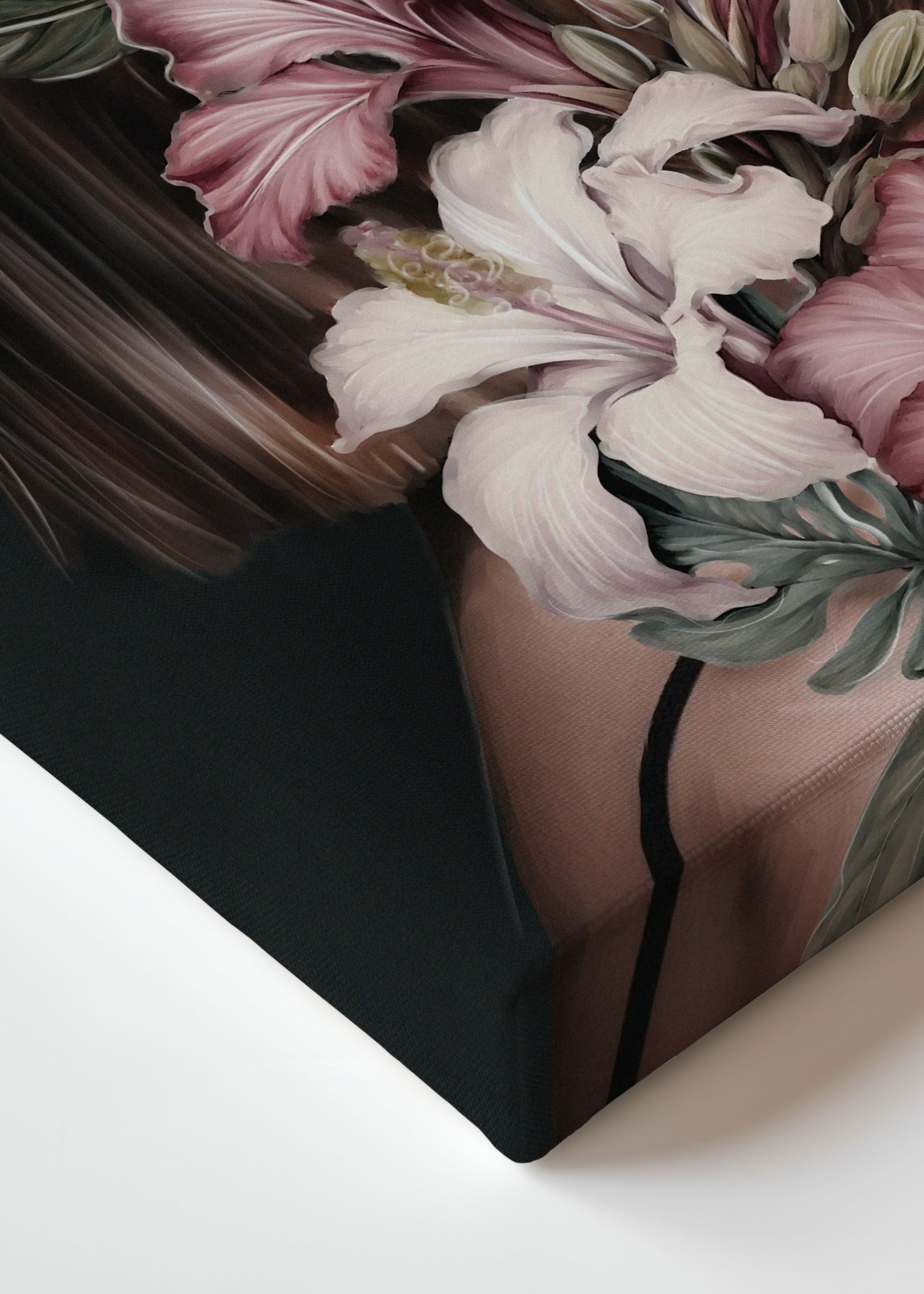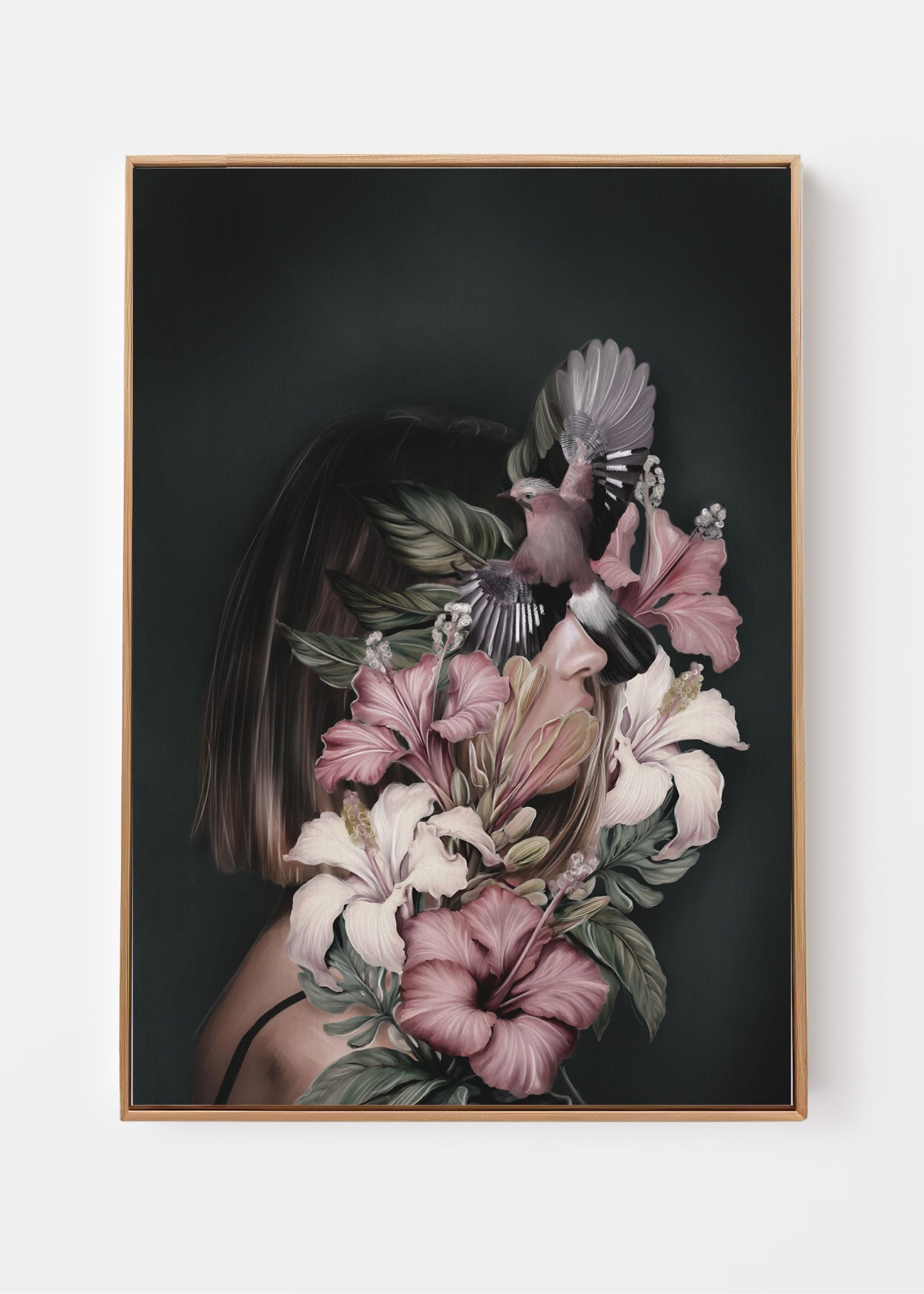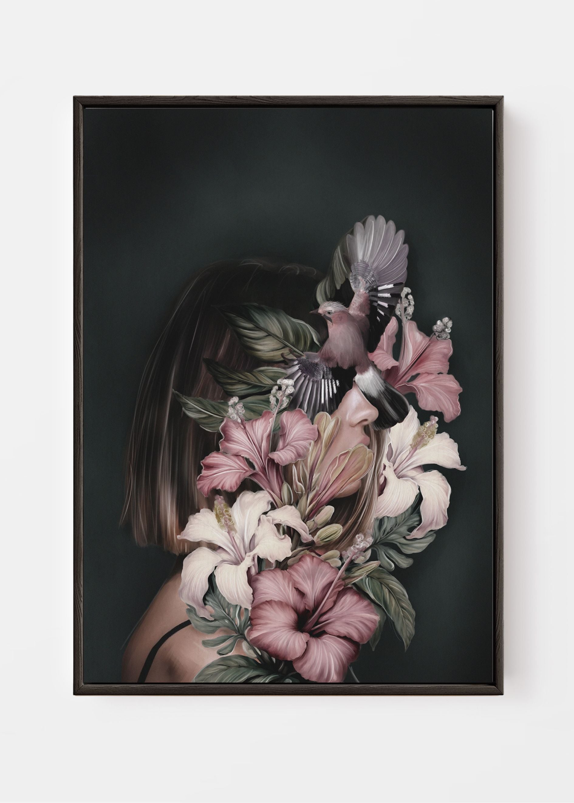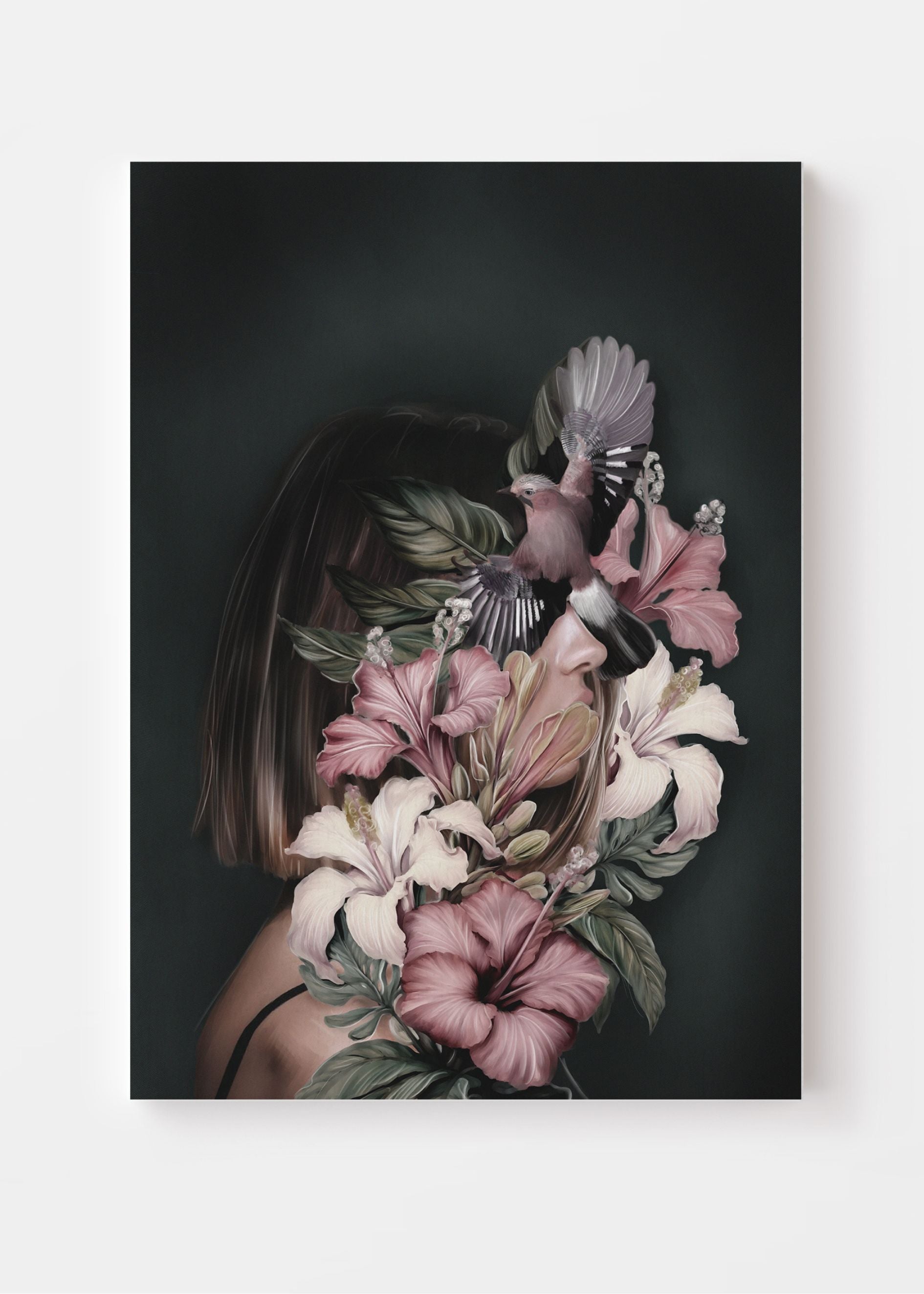 Nydelige Gabriela på lerret! Med sine rosa- og grønntoner i kontrast mot det mørke, gir hun en dramatisk men stilfull effekt. Legg merke til detaljene - denne gjør seg fint i stor størrelse som et statement på veggen.